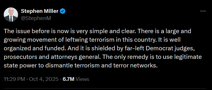 “There is a large and growing movement of leftwing terrorism in this country,” Miller fired back on social media. “It is well organized and funded. And it is shielded by far-left Democrat judges, prosecutors and attorneys general.”