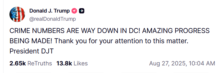 In another post on Truth Social, Trump claimed: “Crime is way down in Washington, D.C., since my Administration took action. The people are thrilled!”